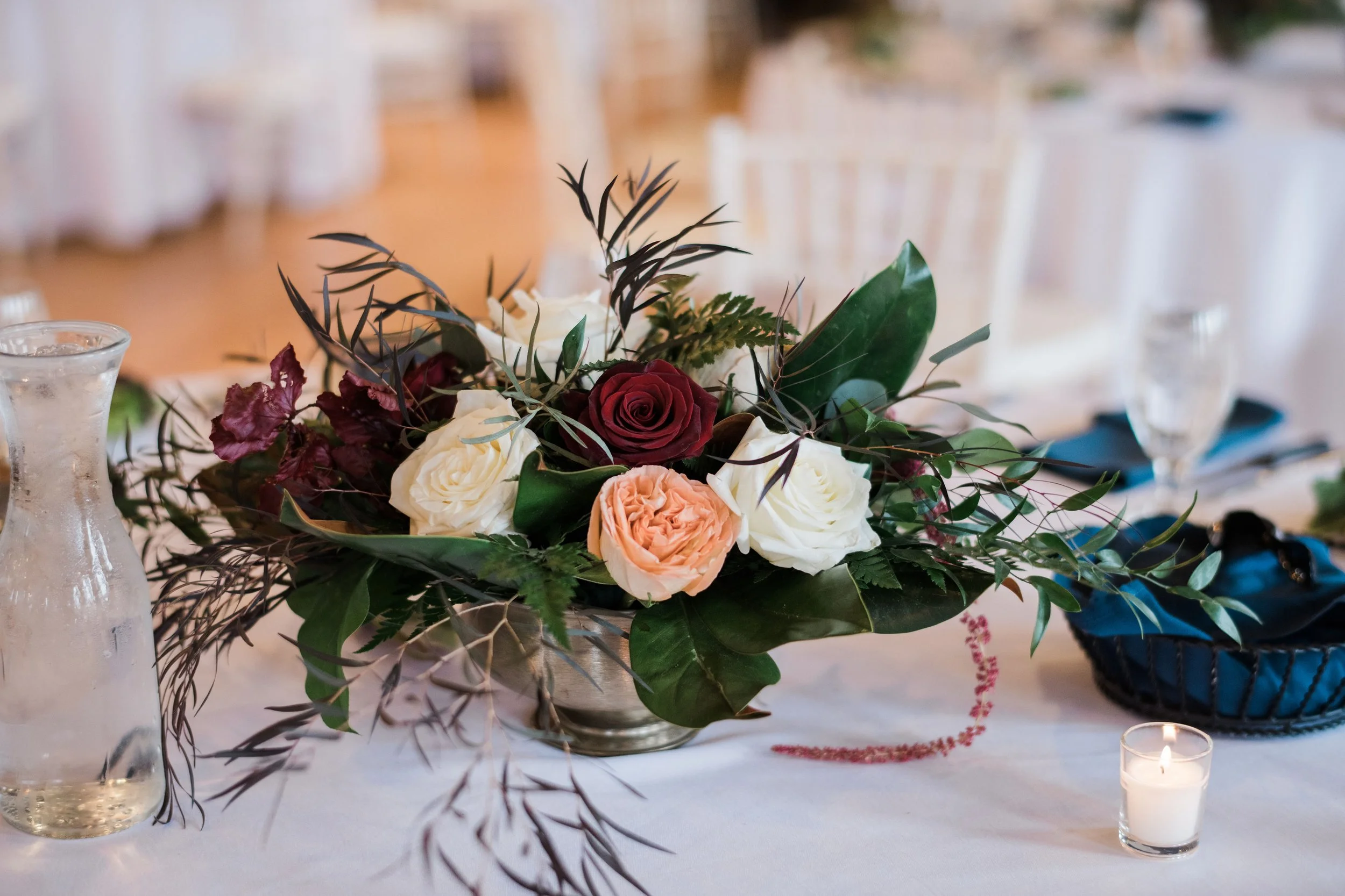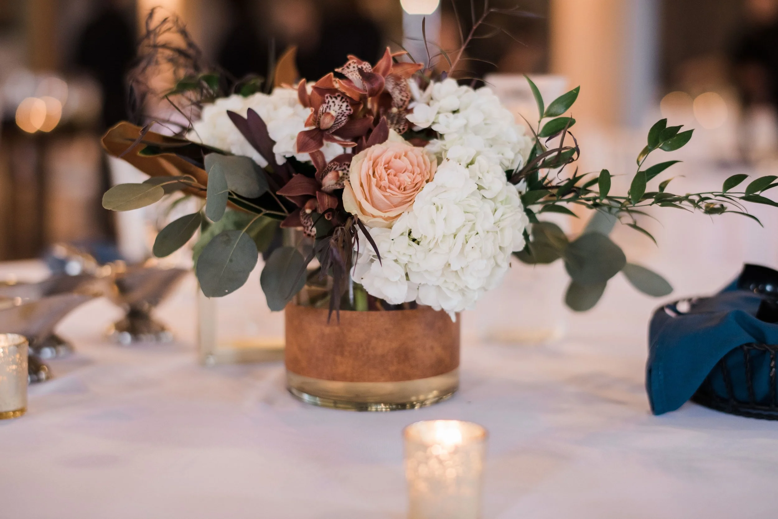 The dinner tables were dressed in white linens and held a simple elegant floral arrangement. Each arrangement displayed the couples bloom story in different ways. I love using similar flowers and creating different looks on each table.